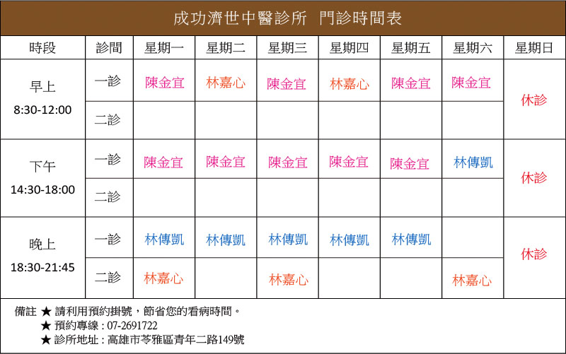 ※醫師門診表僅供參考,實際可能有所異動,歡迎來電詢問。