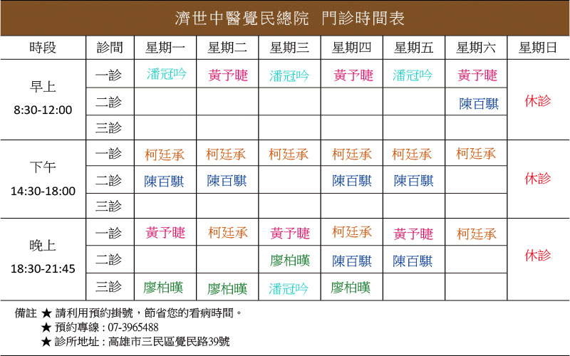 ※醫師門診表僅供參考,實際可能有所異動,歡迎來電詢問。