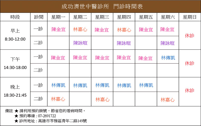 ※醫師門診表僅供參考,實際可能有所異動,歡迎來電詢問。