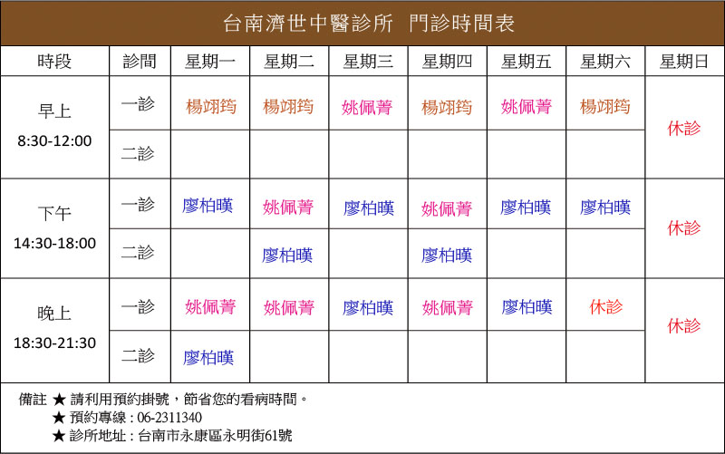 ※醫師門診表僅供參考,實際可能有所異動,歡迎來電詢問。