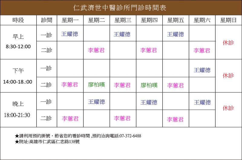 ※醫師門診表僅供參考,實際可能有所異動,歡迎來電詢問。