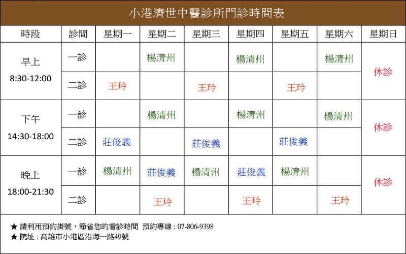 ※醫師門診表僅供參考,實際可能有所異動,歡迎來電詢問。