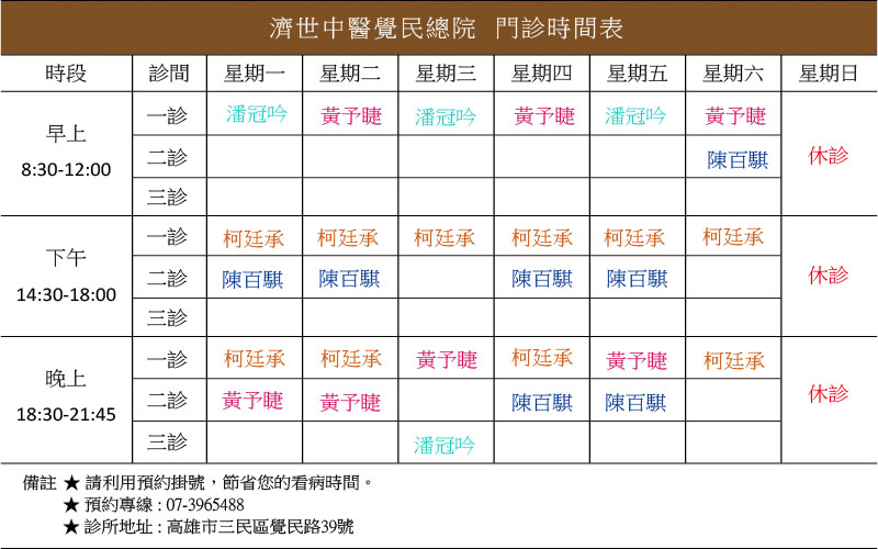 ※醫師門診表僅供參考,實際可能有所異動,歡迎來電詢問。